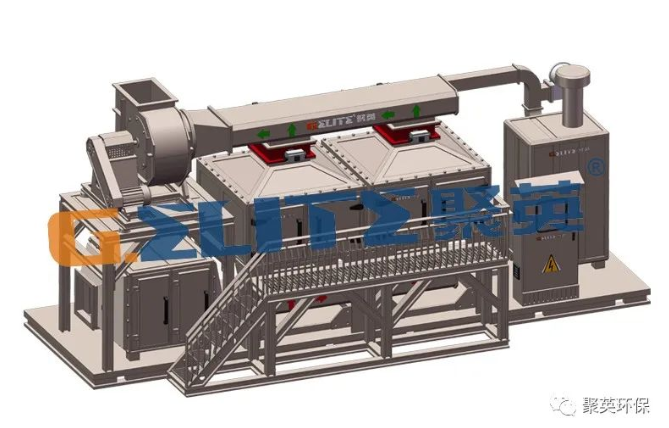 由環保離心風機將大風量、低濃度有機廢氣吸入沸石吸附床,在吸附床內與多層蜂窩狀沸石充分凈化(吸附),沸石內部逐漸富集濃縮大量有機廢物,而潔凈的氣體則排入大氣;通過燃燒裝置產生的高溫氣體經換熱之后通入活性炭吸附床,使內部有機廢物300-500℃高溫氣化從活性炭孔隙中逸散而出,此時的廢氣濃度遠遠高于初始吸附的廢氣濃度,然后進入催化燃燒裝置(350℃)進行氧化分解成CO 和H O等無害氣體,氣體經由熱交換器將熱量傳遞再次用于脫附,排入大氣,以此完成一整套凈化流程。