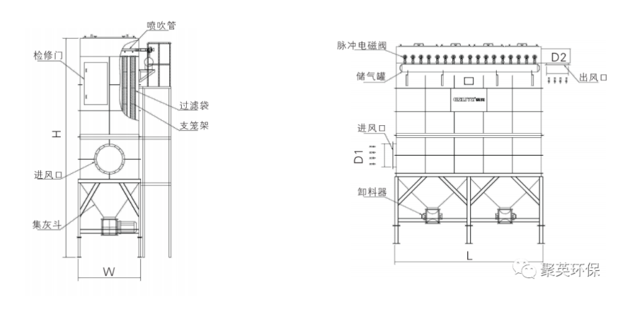 含塵氣體進入脈沖袋式除塵器,氣流流經灰斗,流速放慢,慣性作用使粗顆粒粉塵直接落入灰斗。起預收塵的作用,氣流隨后通過內部裝有金屬骨架的濾袋,粉塵被捕集在濾袋表面,凈化后氣體匯集到出風口排出,除塵器運行過程中,積附在濾袋上的粉塵越來越多,濾袋阻力增加,處理風量逐漸減少,為正常工作,需對濾袋進行清灰,由脈沖控制程序控制脈沖閥開啟,壓縮空氣由噴吹管各孔經文氏管噴射到濾袋內,濾袋瞬間急劇膨脹,使積附在濾袋表面的粉塵脫落。清下粉塵落入灰斗,經排灰系統排出機體。由此使積附在濾袋上的粉塵周期地脈沖噴吹清灰,使脈沖布袋除塵器始終保持高效運行狀態。